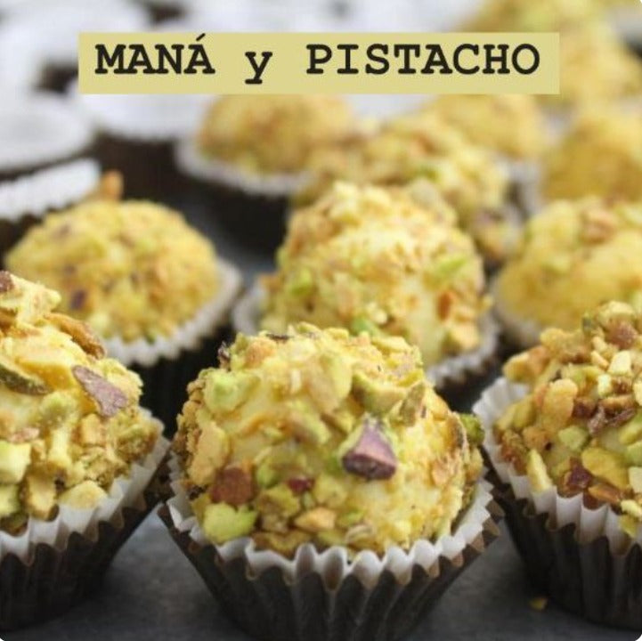 bocadito dulce y celestial, hecho de cubierta de maná relleno con crema de pistacho y cubierto con pistachos picados de tanto amor.