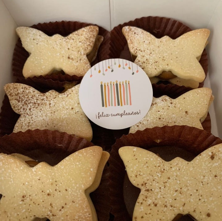 12 alfajores mariposa medianos rellenos de manjar, nuestra cajita de llama Mary posa.