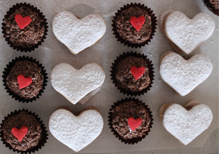 3 alfajores corazón rellenos de manjar con corazón de chococereza.