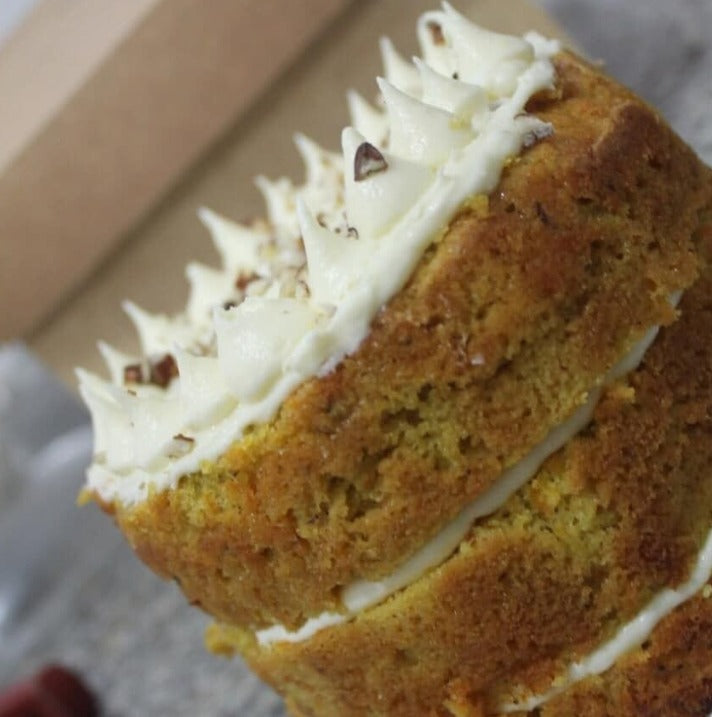 Mini carrot cake con pecanas, relleno de manjar y crema de queso dulce.