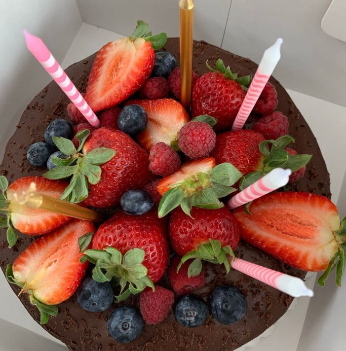 rellena de fudge y chocomanjar, decoración arándanos, fresas, aguaymantos.
