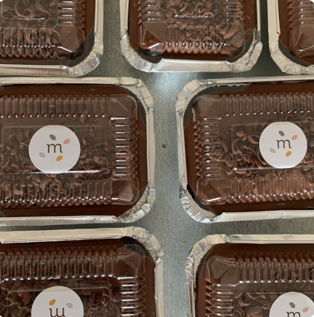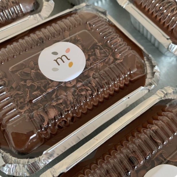 Envase individual de torta de chocolate, fudge hecho con cacao, relleno de fudge, chocomanjar y cubierta de fudge.
